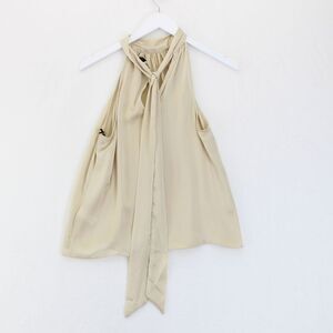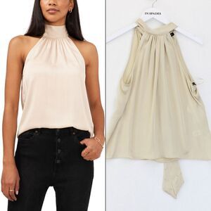 A rich satiny finish elevates this high-neck sleeveless top styled with soft gathers and a flowy fit.