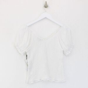 Sweet smocking shapes this clean-white blouse designed with sheer puff sleeves and frilled accents.