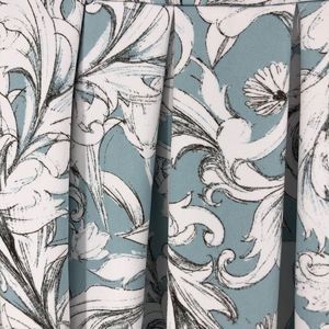 Pretty little skirt with a banded waist, hidden side zip, drawn floral print in aqua/seafoam, white and black, with pleating for movement. Unlined. Material has stretch.