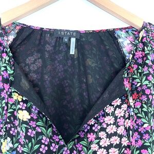 1.State Ditsy Patches Mixed Black Floral Blouse with Sheer Sleeves