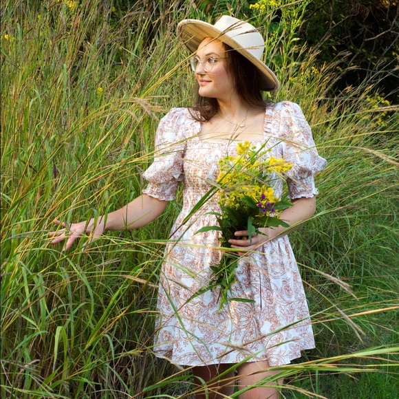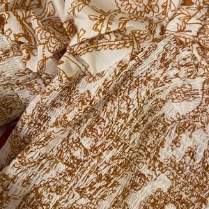 Adorable dress from 1.State in a size large, only worn once for photos. Golden yellow and off white pattern with puff sleeves and elastic in the bodice and sleeves. Size large but could fit from medium to xl due to the elastic throughout. This dress hit me just above my knees, note that I am 5’10 for reference.