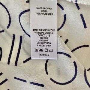• 100% Polyester - White/Navy Pattern - Medium Size runs small - 22.5” Length from shoulder to hem, 19.5” W Bust line, Extra Button Included. Slightly Sheer Top.