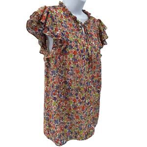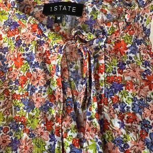 1.State Ruffled Top Sz M Carmine Rose Multicolor Floral Flutter Sleeve Tie Neck