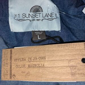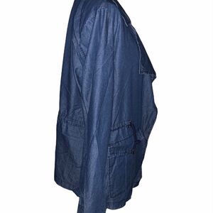 Magnolia blue chambray lightweight jacket. Long sleeve with snap button cuffs. Side pockets with flap and snap button closure. Drawstring waist. Open front. 100% cotton. Size: large. NWT.