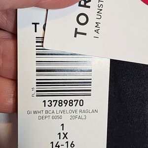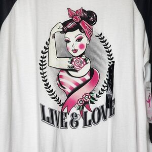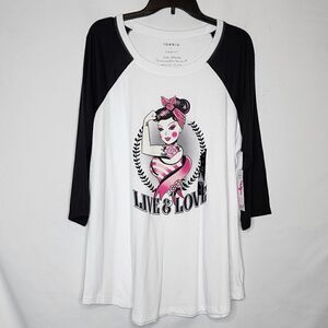 1X 14W 16W Torrid Breast Cancer Awareness Baseball Tee Live & Love Tattoo October Awareness black & white reglan shirttail hem 3/4 sleeves. NWT Torrid. Measurements for reference only approximately shoulder to hem 28" under arm to under arm 23" sleeve inseam 13" wt 8oz