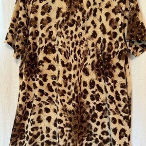 Ashley Jill giraffe print short sleeve top very silky perfect for dress or jeans. Size 1X. Gold speckles throughout