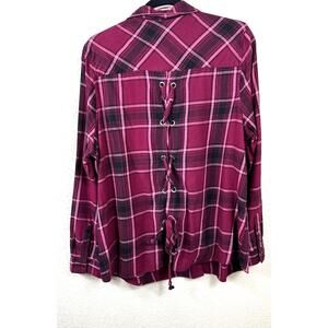 Krazy Kat burgundy and black plaid shirt, 1X. Features lace-up grommet back detail for a corset-inspired look, long sleeves, and front chest pocket. Made in India.