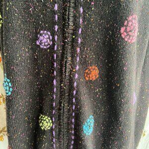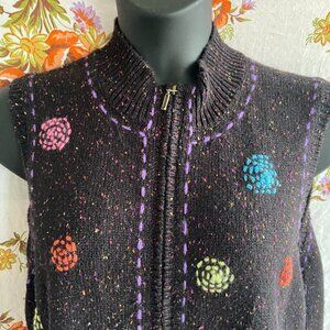1X Wool Blend Coldwater Creek black zip-up sweater vest with multi-coloured spirals starburst flower embroidery #retrofashion