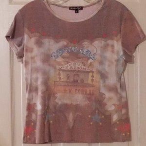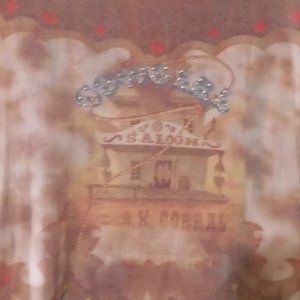1pc Preowned. Great Condition. Cowgirl on front has sequins. Light brown/tan, Cowgirl in blue, saloon, OK corral on it.