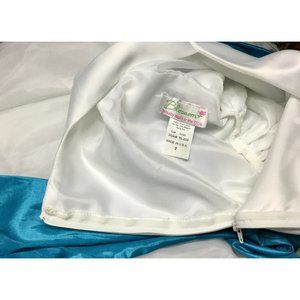 Worn once. A flower girl or First Communion dress. Sleeveless, size 7, the skirt has 2 layers of tulle overlay. Both the dress & lining are polyester. The underlining has crinoline to keep the skirt bottom full. Approx measurements, laid flat:
