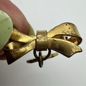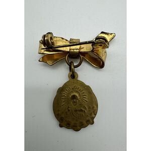 This beautiful vintage piece features a classic gold-tone bow and ribbon design with a small religious charm depicting Mary and Jesus. Measuring approximately 2 1/2 inches, it can be worn as either a pendant or a brooch/pin, making it a versatile addition to any jewelry collection.