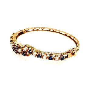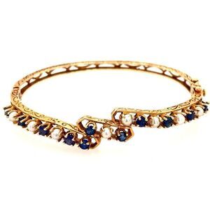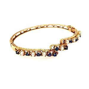 Real 14k Yellow Gold Antique Bangle with Real Pearls and Blue Sapphires, NOT GOLD PLATED OR FILLED.