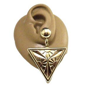 Sun beam triangle shape dangle discs surgical steel post pierced earrings vintage gold tone decorative imprinted metal finish large round top domed connector button. In excellent vintage condition. Measure 2 1/8 inches long 1 1/2 inches wide.