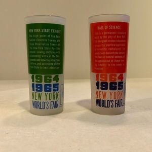 (2) 1964 1965 New York World’s Fair frosted glasses. In very good used condition. (2) frosted glasses - (1) New York State Exhibit Hall, in blue, & green coloring. (1) Hall of Science in orange, & blue coloring. Some minor wear to graphics. Copyright 1961 New York World’s Fair 1964-1965 Corporation. Measurements approximate. Height 6 5/8 in. Top outer diameter 2 3/4 in. Bottom outer diameter 2 1/4 in. Set #2. Color not quite as dark as shown. 0102 M5