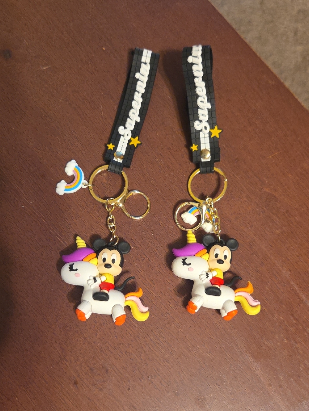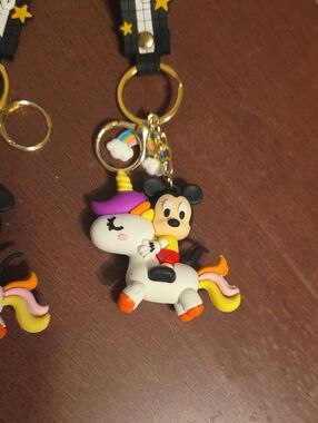 Bundle of 2 new. Mickey Mouse riding a unicorn PVC keychains with wrist straps.