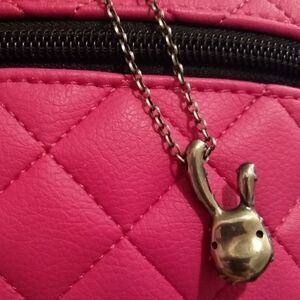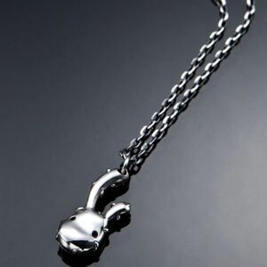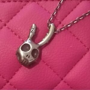 This cool necklaces features a two face rabbit pendant showing an airhead rabbit face on one side and a skeletal rabbit face details using 925 silver hardware on a simple chain-link necklace.