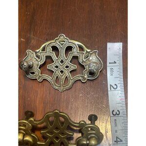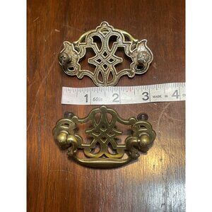2 Antique Brass Drawer Pulls Queen Anne Intricate Design Screws 3.5" x 2.5"