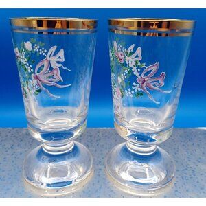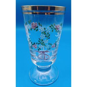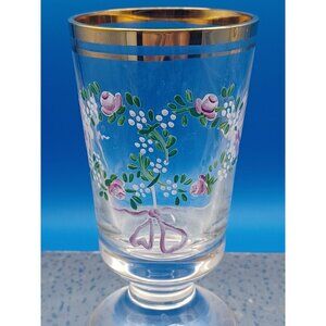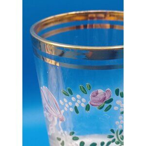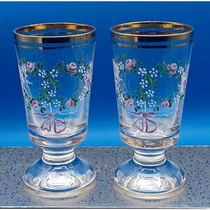 Crafted by the renowned Moser, this enchanting pair of hand-painted enameled glasses carries whispers of a bygone era. Delicate floral details and gold rims tell a story of timeless artistry, perfect for elevating cherished moments. Each glass, with its unique craftsmanship, echoes the elegance of antique treasures.