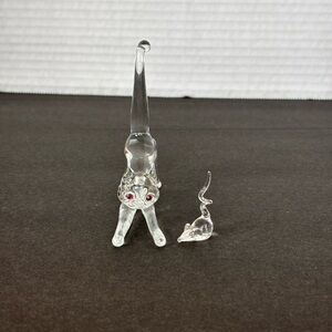 Adorable art glass cat and mouse figurines. The cat is in a playful scrunched down position ready to pounce on the mouse. The cat has pink crystal eyes and a long tail. The mouse is simply adorable with its long curled tail. These are perfect for the cat lover in your life! These are in perfect condition except for the very tip of the mouse’s tail which is sharp to the touch so it’s been chipped but you can’t see it unless you feel it. Cat measures approximately 3x3 and the mouse 1X.75.