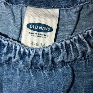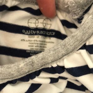 This is a bundle of 2 Rompers. Striped cotton is from Egg size 3 month and denim ruffle sleeve from Old Navy 3-6 months. Both are in perfect like new condition; not stains or tears and from smoke free home