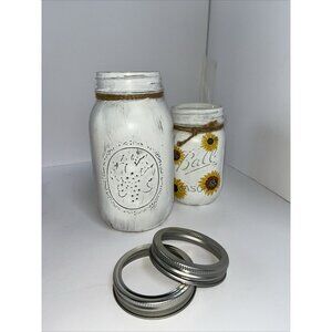 Retro Country Chic Vibes! - Two Classic ball mason jars: 32oz; 3.5x3.5x7 small neck, and 16oz; 3.5x3.5x5.125 small neck. These hand painted masons are gems. Add a touch of summer to your home decor with these two hand-painted Ball Mason jars. The larger 32oz jar features a charming bicycle and sunflower design, and smaller 16oz jar mirrors the sunflower design. Perfect for holding dried flowers, utensils, or other small items.