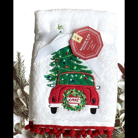 2 Balsam & Fir Embroidered Christmas Bathroom Fringe HAND TOWEL Set Car w/Tree