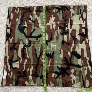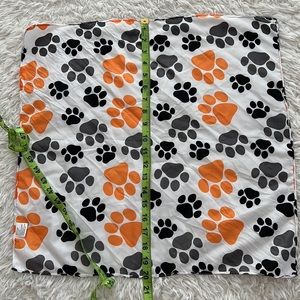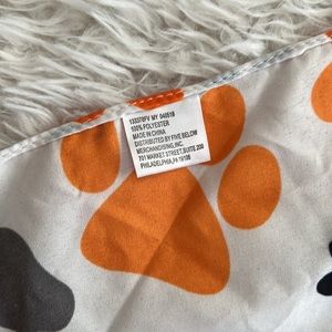 Pack of 2 bandanas. One is camo with green, black, and brown. The other is white with orange and black paw prints. Some wear (shown in the last picture) but nothing major.