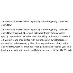 2 Bath & Body Works Velvet Sugar Daily Nourishing Body Lotion, 8oz. each, New. This quick absorbing, lightweight body lotion absorbs quickly to provide up to 24 hours of nourishing moisture. Has coconut oil, vitamin E and shea butter with the undeniably sweet fragrance notes of red velvet creme, golden plum, sugared musk, pink jasmine and wild strawberries. This body lotion pampers and soothes your skin leaving your skin soft, supple, and lightly fragranced. Retail $14.95 each.