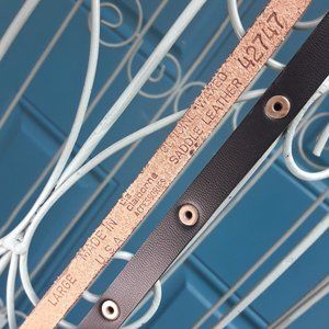Genuine Waxed Saddle Leather Belt Metal Thin real leather belt with gold metal elt Buckle is Vintage Liz. Size Large Should fit 31, 32, 3, 4, 45 or 36 inches around as it has 6 loop holes. Total length 38 1/2 inches X 6/8 inch width.