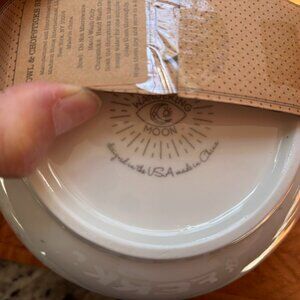 This is (2) Bowls with Chopstick sets that are white with small black dots and black designs on the front and back. The diameter of the bowl is 6in and almost 4in deep. There are small holes in the top of the bowl to hold the chopsticks, making it easy to keep the bowl and chopsticks together. The instructions say to handwash only for both pieces and also not to use in the microwave. They were designed in USA and made in China by Wandering Moon.