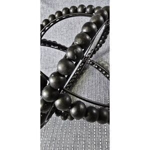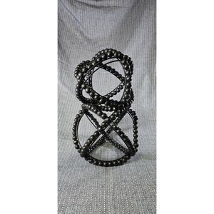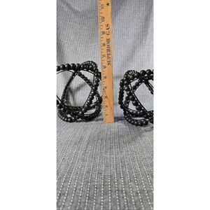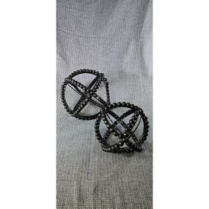 Each piece features a sleek black metal orb suspended within a frame of smooth, matte-finished wooden beads, creating a bold contrast of texture and form. The minimalist design blends modern industrial style with organic warmth, making them perfect for shelves, mantels, or tabletop displays.Whether styled together for a symmetrical look or placed separately to accent different areas, these sculptures add depth and visual interest to any room. Ideal for lovers of contemporary décor, they serve as eye-catching conversation pieces while maintaining a clean, sophisticated aesthetic.