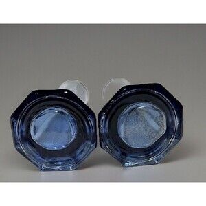 Add a touch of sophistication to your dining table with these stunning (2) Blue Glass Art Deco MCM Salt & Pepper Shakers.these fluted shakers feature a glossy finish and blue metal caps. The solid pattern and backstamp print add to their art glass production style.