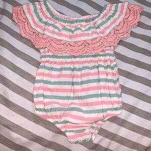 2 Bonnie Baby Rompers. One W/ optional off or On Shoulder-Crochet lace details, Snaps At Crotch |. The other a floral chiffon with cute ruffled edge also snaps at crotch