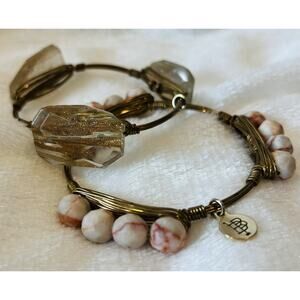 2 Bourbon & Bowties Gold Stone Bangle Bracelet Quartz Jasper Boho Wire Wrapped