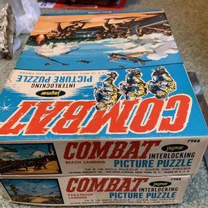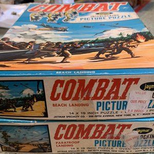 You are buying 2 Boxed very early 1960’s JAYMAR COMBAT Tv Show puzzles featuring Paratroopers and a Beach LANDING. Great color and awesome looking MILITARY PUZZLES. The Condition is Used. Shipped with USPS Priority Mail. Lucky winner to pay for priority delivery confirmed shipping. We ship within 24 hours of payment. We will leave positive feedback after we get positive feedback. Contact us if you run in to any problems BEFORE you leave feedback. Good luck!