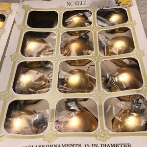 Here are 2 Boxes of Vintage Christmas Ornament American Made by Noelle all gold color in old condition, one box has only 11 ornaments The other box has 12. They are one and three-quarter inches in diameter