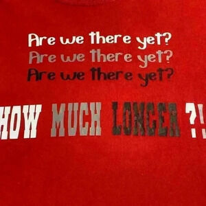 2 Boys T shirts in red ARE WE THERE YET HOW MUCH LONGER sizes Medium & Large.