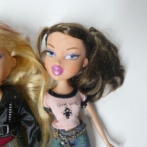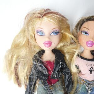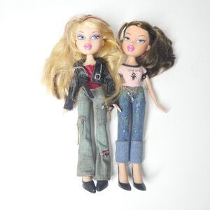 Pair of Bratz dolls. One appears to be a Twiins Phoebe. The other is an unidentified blonde, possibly Cloe. She seems to be wearing clothes from other dolls including pants from Wildlife Safari Fianna and a leather jacket from Twiins Roxi. Please see photos for more information about the dolls and clothing included in this lot.