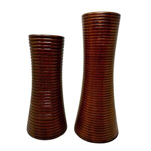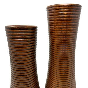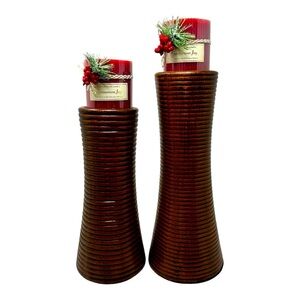 2 Brown Ribbed Ceramic Tower Candle Holders.