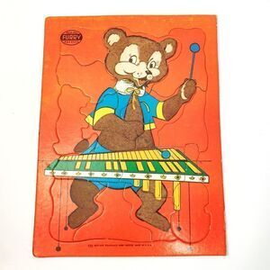 Inlaid cardboard puzzles featuring a furry bunny with a carrot and a furry bear playing the xylophone, by Built Rite Sta-N-Place.