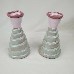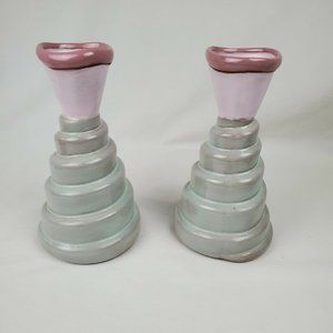 2 Butter and Toast Pottery Vintage Candlesticks Holders Ziggurat Memphis Style