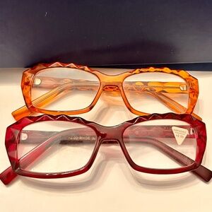 Calabria Crystal Readers. 1 pair is considered Pink, but it's a darker Pink. They're NWOT. The other pair is considered Orange. They were worn a few times but no indication that they were. Both have a strength of 2.0.