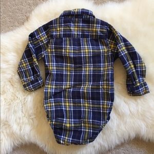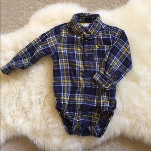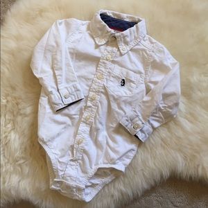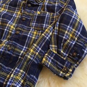 2 dress shirts by Carter's with long sleeves, centered button down closure, single chest pocket and snap button closure at bottom. One in white and the other in navy, white and yellow. Both worn once and have no sign of wear.