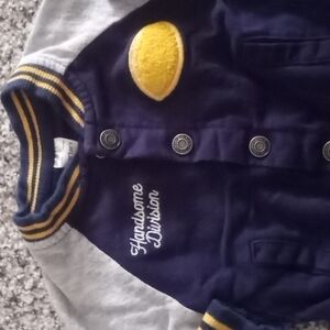 Navy blue, Grey and yellow jacket is designed with football in mind. Handsome Division embroidery on front along with a Yellow football. Snaps for closure.