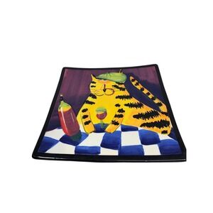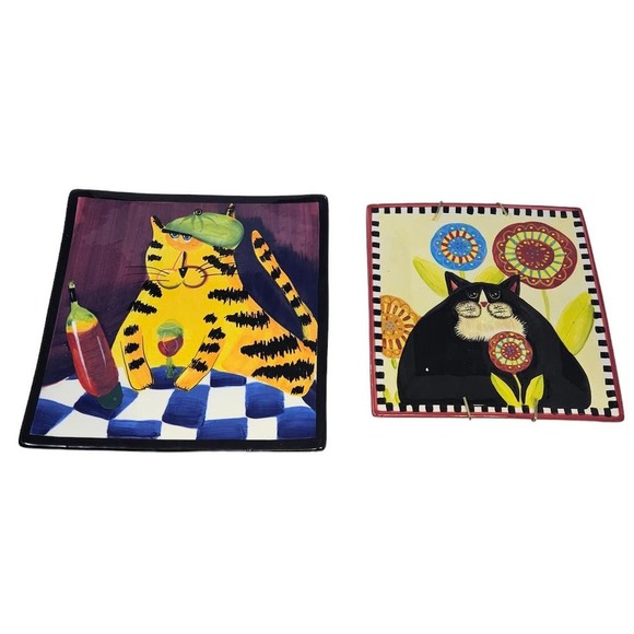 2 Ceramic Cat Plates Decorative Square Kitsch Wine Floral Naylor Designs Roscher
