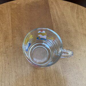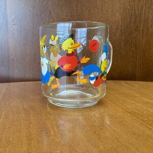 Arcoroc France Glass Children's Mug features fun cartoon style animals parading around the mug including a Monkey, Rabbit, Fox and Duck. Very Good Vintage condition - no chips / cracks - minimal signs of wear. 3” high.