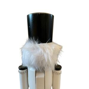 The nutcracker stands tall with a traditional and regal appearance, featuring a black and white color scheme with silver accents. It is adorned with a tall black hat, decorated with a soft white feather at the front.