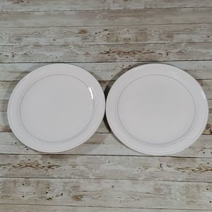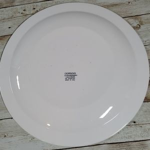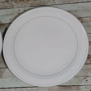 Item Description: 2 CORNING PYROCERAM 10¼" White Dinner Plates in the Whispering Mist Pattern on the rim. Each plate is in very good used condition.