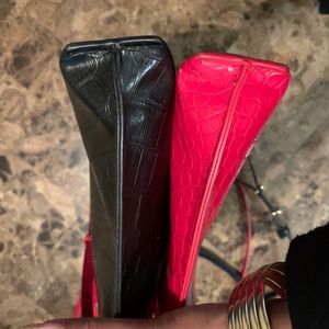 Price is for both, they are same size, one red, one black, with gold color zipper/hardware. Used condition but they still look good, not too much wear and tear but again they are used. Little dusty inside from sitting in closet so they need a little cleaning. Straps are adjustable for length to wear as crossbody as well as removable for carrying as clutch. Very cute and convenient for on the go, fits any size cell phone, makeup, wallet, keys, etc.. Price is for both, please ask questions if needed an do close up on pics! Send me an offer if interested 🤗 2 free used clutches come with purchase if purchase at listing price, so you’ll receive 4 items. Black and burgundy clutch.