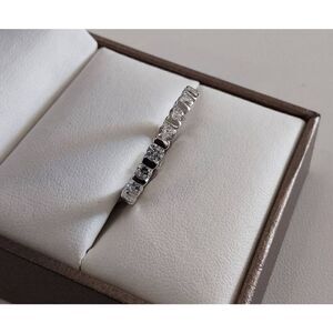 This gorgeous eternity band ring features two carats of AAA quality genuine diamond simulant stones that are channel set into the band and alternated with solid sterling silver bar designs. The band and setting is done with a full 3 grams of .925 solid sterling silver and is stamped with authenticity. It has then been layered in platinum for a lifetime of tarnish free shine and durability. It is size 9.